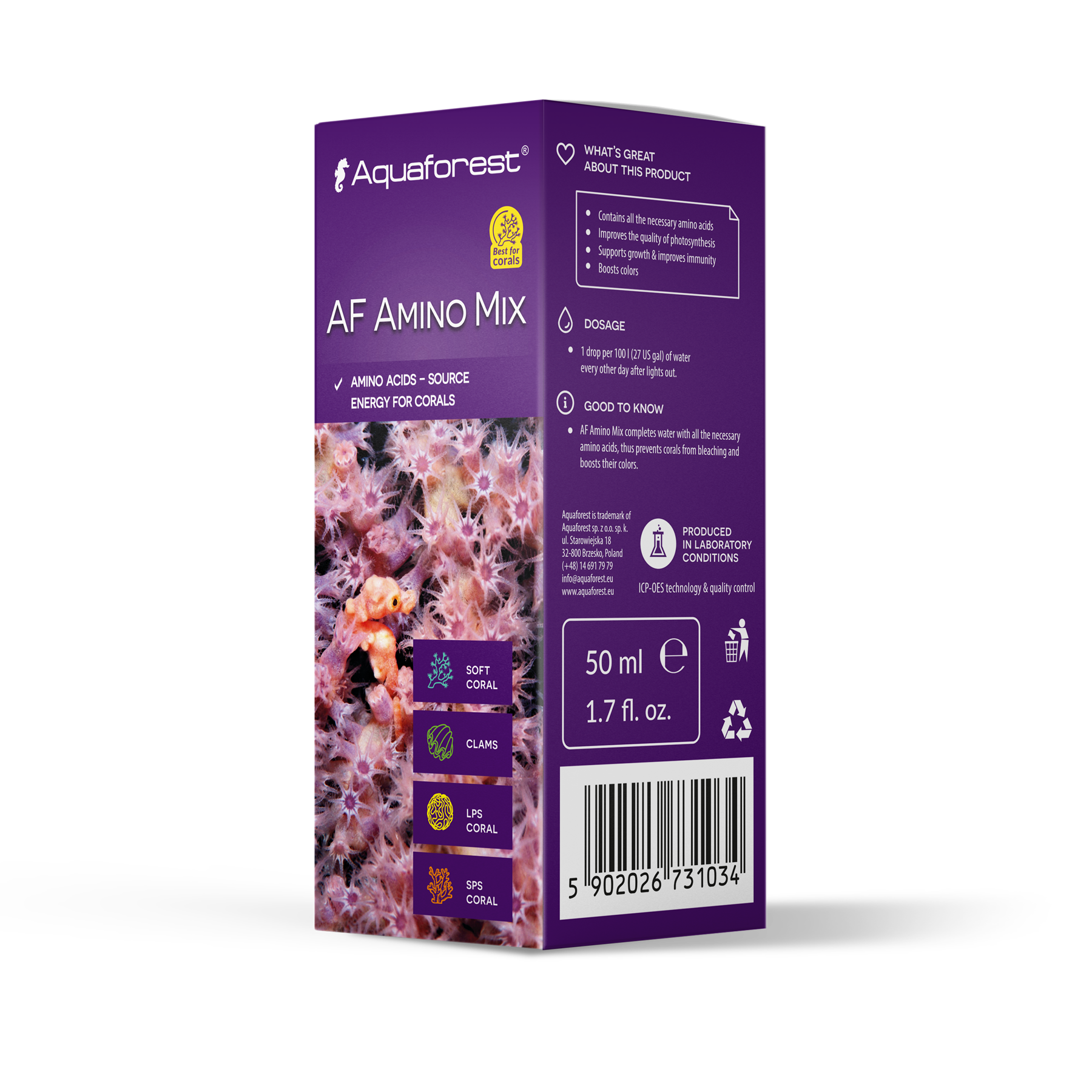 AF Amino Mix completes water with all the necessary amino acids, thus prevents corals from bleaching and boosts their colors. The unique composition of AF Amino Mix is based, among others, on biotin, alanine, glutamine, leucine, lysine and serine. Carefully selected set of amino acids increases the amount of zooxanthellae which support the production of photosynthetic pigments such as chlorophyll. Thus, Amino Mix not only boosts coloration, but also improves the quality of photosynthesis. As a result corals derive more energy from the light, stay in perfect condition and grow faster. Regular use of AF Amino Mix improves immunity and noticeably accelerates corals’ growth1 drop per 100 l (27 US gal) of water every other day after lights out.