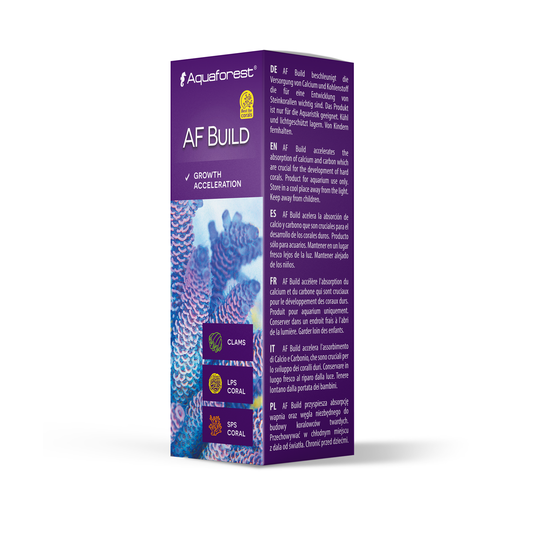 AF Build accelerates the absorption of calcium and carbon which are crucial for the development of hard corals. By providing the corals with all the necessary ingredients, it facilitates and accelerates calcification, favourably affecting the growth rate. In addition, AF Build raises the pH level in reef aquariums. By keeping the pH at a proper, constant level, it additionally promotes coral growth. Long-term pH level aberrations result with slower calcification, inhibition of limestone algae growth and in extreme cases may completely stop the calcification process. Regular usage of AF Build prevents unfavourable fluctuations of pH levels and, by balancing the parameters in the aquarium, it improves the clarity of water and supports the growth of corals. Due to its unique properties, AF Build reduces the amount of lower-order algae and inhibits the growth of pathogenic cyanobacteria. Decomposing food may be one of the causes of the drop in pH, therefore AF Build should be used during intensive coral feeding, especially when using a highly nutritional AF Energy supplement. AF Build contains: iodides, calcium carbonate. DOSAGE: 1 drop per 100 l (27 US gal) of water every other day after lights out. Do not dilute. Do not mix together with other products in one container. The product can be dosed by a dosing pump, provided it dispenses with drops. Once opened store in the fridge, if the temperature exceeds 24°C (75°F). All coral supplements have a recommended dosage of 1 drop per 100 l (27 US gal) of water, though, it’s important that each aquarium is different and the dosage may vary depending on the coral cast. We recommend starting dosing foods and supplements from half of the dose (even ¼) and observing the corals and their reactions to the administered food. Once the aquarium shows no sign of overdose, we recommend increasing dosage to the target dose. In order to facilitate the food absorption, SPS and LPS corals should be fed after the light is out. Corals such as Zoanthus, Ricordea and other mushroom corals should be fed during the day. In order to ensure the best nutrients absorption, all supplements and foods for corals should be dispensed directly into the aquarium. During the feeding we recommend switching off the skimmer for about an hour. Do not overtighten the screw, otherwise the cover might be damaged.