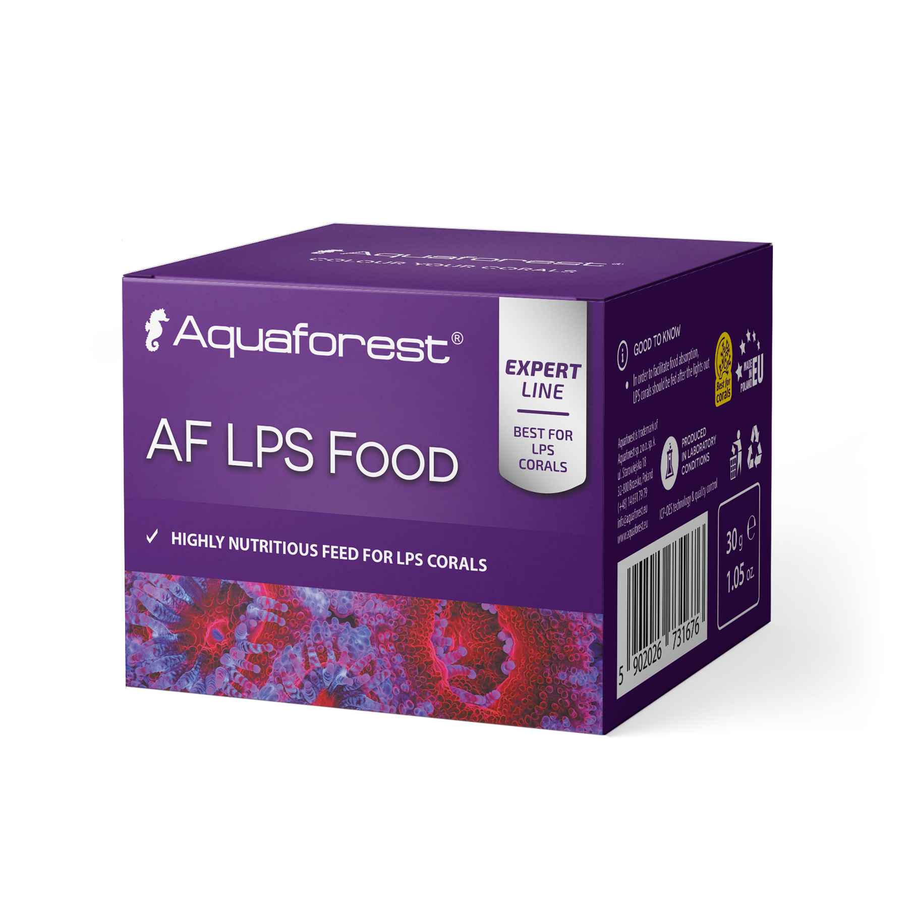 Granular food dedicated especially for LPS corals. AF LPS Food is rich in protein and highly nutritious fatty acids that are essential to the health of marine animals. We recommend to feed your corals 1 measuring spoon at night per 100 L (27 US gal) or directly targeted above your corals. DOSAGE: All Aquaforest formulas are adopted to dispense 1 measure spoon at 100L (27 US gal) of water. However, it should be remembered that each aquarium is different, depending of reef cast. By introducing new products to aquarium you should begin dispensing 1/2 (even 1/4) dose and observe how the corals respond. Then gradually increase the dosage to reach the target. Corals should be fed at night when they extend their polyps.