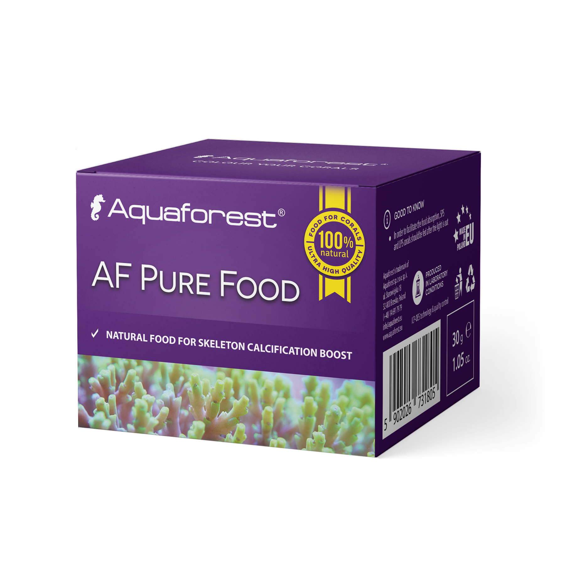 AF Pure Food is 100% natural food for corals. The composition based on calcium carbonate provides the inhabitants of the aquarium with all necessary micro and macro elements, thus ensures healthy growth and eases calcification. Due to its special origin, AF Pure Food is a food that corals eat in their natural habitat. The unique composition of the product guarantees intense growth. Rich in calcium carbonate formula has also a positive effect on maintaining the pH at a stable level. DOSAGE: 1 measuring spoon per 100 l (27 US gal) of water. Fill a small container with approx. 20 ml of aquarium water, add a spoon of AF Pure Food and mix for one minute. Pour the suspension directly into the tank or use the pipette to feed selected corals. Use at least once a week. In well-planted, mature aquariums the product can be used more often, even daily. All powdered foods have a recommended dosage of 1 spoon per 100 l (27 US gal) of water, though, it’s important that each aquarium is different and the dosage may vary depending on the coral cast. We recommend starting dosing foods and supplements from half of the dose (even ¼) and observing the corals and their reactions to the administered food. Once the aquarium shows no sign of overdose, we recommend increasing dosage to the target dose. Corals such as Zoanthus, Ricordea and other mushroom corals should be fed during the day. In order to facilitate the food absorption, SPS and LPS corals should be fed after the light is out. In order to ensure the best nutrients absorption, all supplements and foods for corals should be dispensed directly into the aquarium. During the feeding we recommend switching off the skimmer for about an hour.