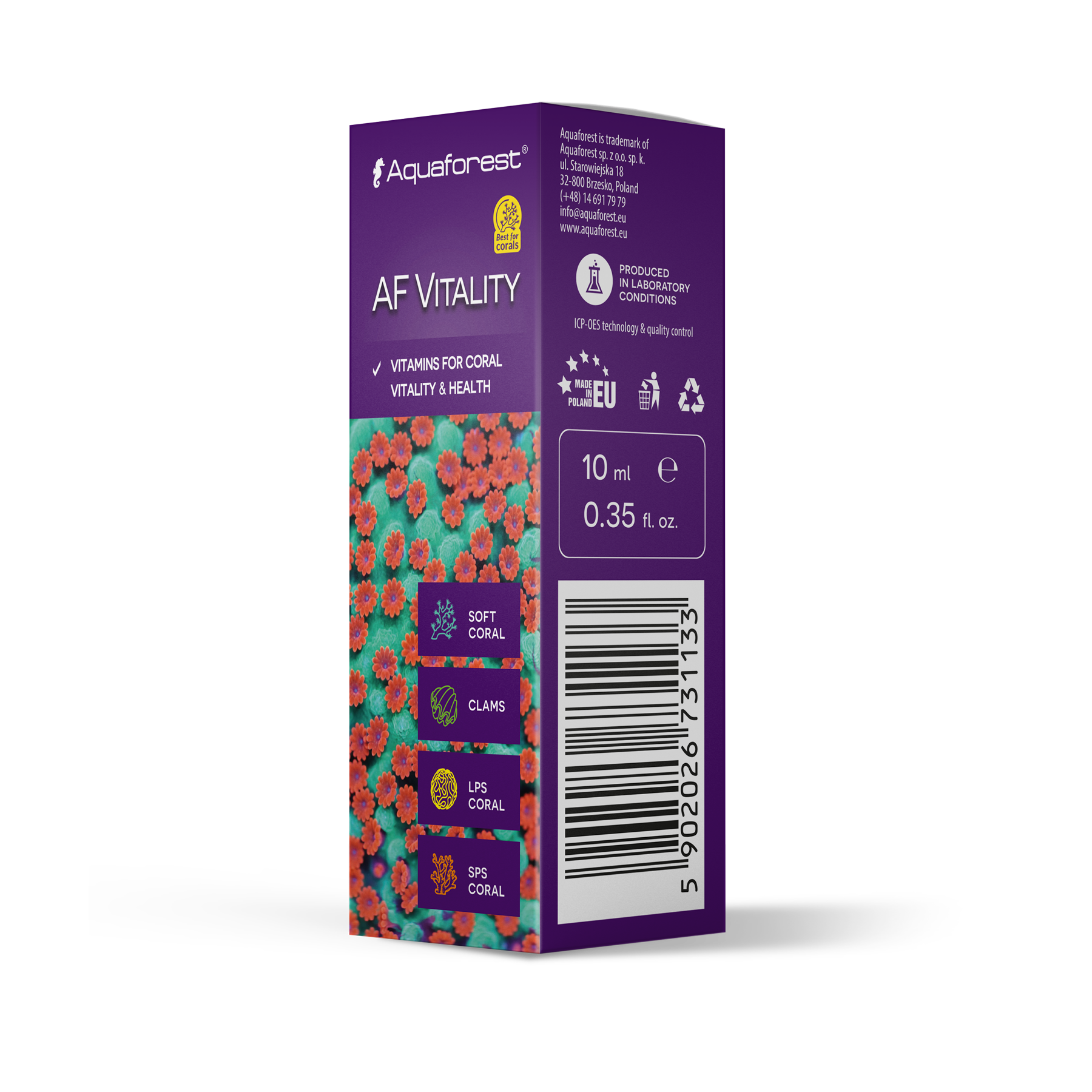 A supplement containing concentrated vitamins for corals. The use of ozonators, active carbon cartridges and strong skimmers can lead to sterilization of water and, as a result, to vitamin deficiencies. AF Vitality completes the water with all the necessary vitamins that are removed by the filtration system in a closed aquarium system. In order to provide the most important ingredients for the proper development of corals, the unique formula is based on B vitamins. AF Vitality is a special set of vitamins designed to obtain the best coral coloring. It boosts the intensity of colors and provides the inhabitants of the aquarium with continuous access to vitamins which improve corals condition. The product contains vitamins: A, B1, B2, B6, B12, C, D3, E and K3. Due to its unique composition, it creates optimal environment with steady parameters, providing corals with ideal conditions for development and wonderful coloring. AF Vitality supplements the water with vitamins necessary for the development of coral, guaranteeing them healthy growth and high immunity. DOSAGE: 1 drop per 100 liters (27 US gal) of water every other day after lights out. Do not dilute. Do not mix together with other products in one container. The product can be dosed by a dosing pump, provided it dispenses with drops. Once opened store in the fridge, if the temperature exceeds 24°C (75°F). All coral supplements have a recommended dosage of 1 drop per 100 l of water, though, it’s important that each aquarium is different and the dosage may vary depending on the coral cast. We recommend starting dosing foods and supplements from half of the dose (even ¼) and observing the corals and their reactions to the administered food. Once the aquarium shows no sign of overdose, we recommend increasing dosage to the target dose. In order to facilitate the food absorption, SPS and LPS corals should be fed after the light is out. Corals such as Zoanthus, Ricordea and other mushroom corals should be fed during the day. In order to ensure the best nutrients absorption, all supplements and foods for corals should be dispensed directly into the aquarium. During the feeding we recommend switching off the skimmer for about an hour. Do not overtighten the screw, otherwise the cover might be damaged.