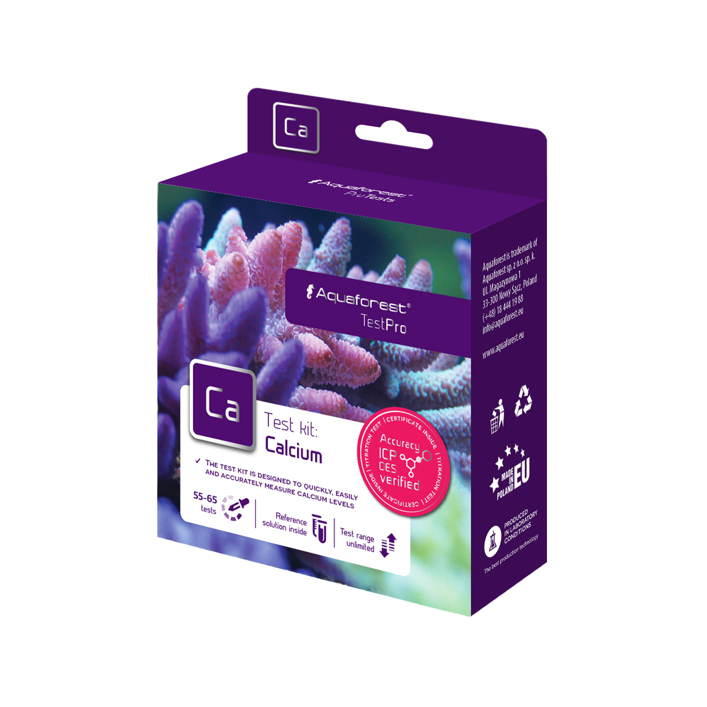 Aquaforest TestPro Ca is designed to quickly measure the calcium content in the marine aquariums, freshwater aquariums, ponds or water reservoirs. In order to ensure the proper functioning of the marine aquarium calcium levels should be maintained in the range 380-460 mg/l (ppm). The set contains enough reagents to perform 55-65 determinations of calcium levels. SET: Reagent A-Ca container, Reagent B-Ca 30 ml bottle