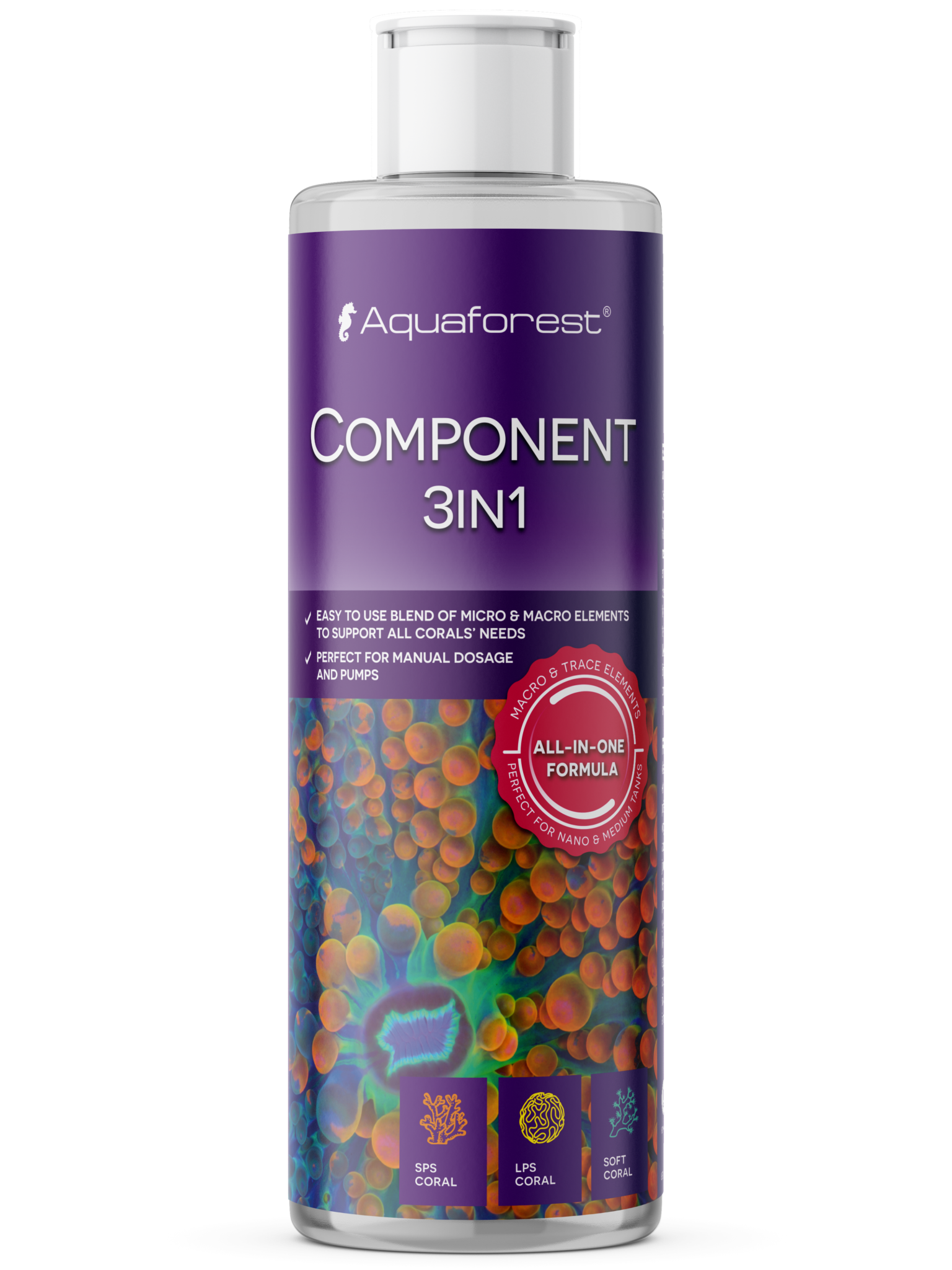 Component 3in1 is a comprehensive product of macro and micro elements, dedicated to marine aquariums, created based on the Balling method. The formula comprises highly concentrated calcium, magnesium, and KH in proportions that precisely align with the requirements of corals. Component 3 in 1 contains organic calcium salts, so it also works as a carbon source in marine aquariums.