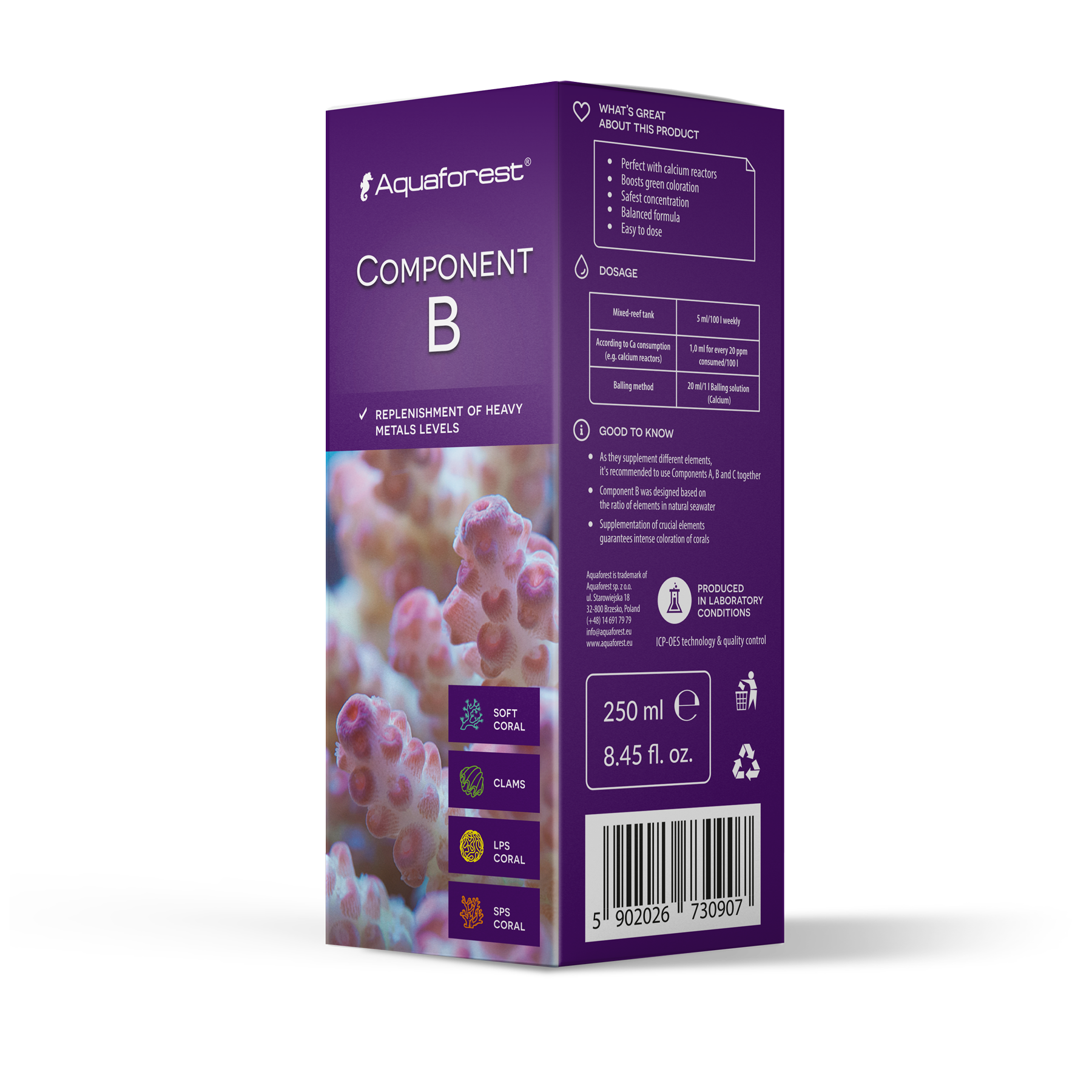 Component B is designed for complementing minor deficiencies of heavy metals in a marine aquarium. Contains: cobalt, copper, chrome, manganese, zinc, nickel, iron. Skimmer and filtration media tend to remove trace elements from the water of closed aquarium system, making micro nutrients supplementation necessary. The unique composition of the preparation ensures supplementing the water with heavy metals essential in the reef aquarium. Component B was designed based on the ratio of elements in natural seawater. Due to supplementation of crucial elements the corals will gain intense coloration and stay in fantastic condition. Safe concentration of the preparation minimizes the chance of micro nutrients overdose, therefore Component B can also be used by novice aquarists.