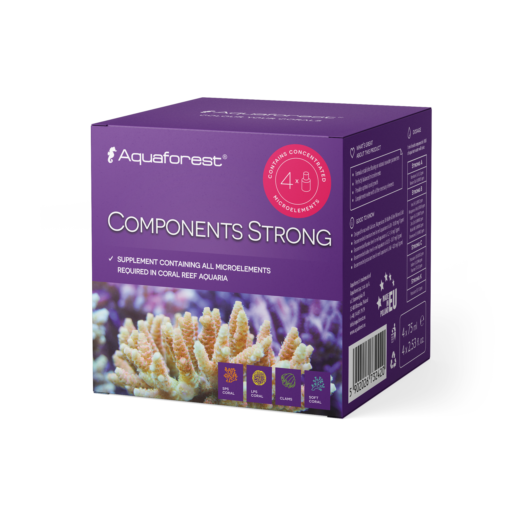Components Strong contains concentrated trace elements intended for use in reef aquariums. Components Strong in combination with Calcium, Magnesium, KH Buffer and Reef Mineral Salt are a complete set designed to maintain a reef aquarium by the method proposed by H. W. Balling, therefore these products should be used in parallel. Due to the fact that the microelements in the aquarium are consumed in the right proportion with the macroelements, the concentrations of Components Strong have been developed based on other values. Only the use of the entire range of Aquaforest products ensures effectiveness and guarantees the chemical balance in the aquarium. The amount of microelements fed depends on the individual needs of the aquarium for magnesium and calcium. SET: Component A Strong Component contains concentrated strontium and barium. The amount of strontium and barium depends on requirements for magnesium and calcium. 5 ml should be added to 1 litre of ready solution of calcium chloride. Recommended use with Aquaforest Calcium products. Capacity: bottle of 75ml