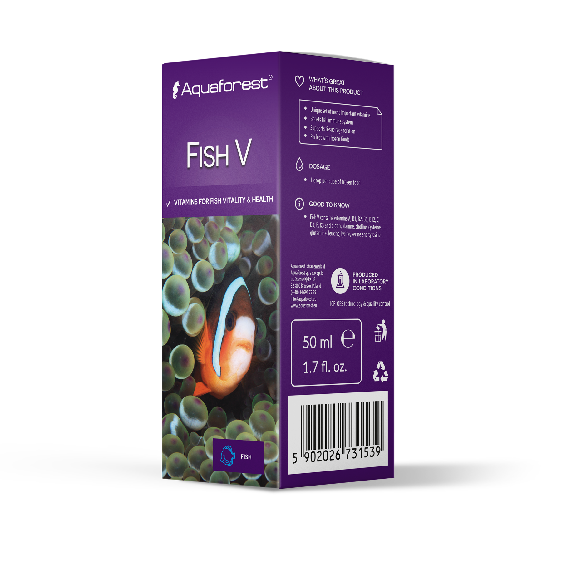 A multivitamin designed for all ornamental fish, both marine and freshwater. Fish V contains vitamins A, B1, B2, B6, B12, C, D3, E, K3 and biotin, alanine, choline, cysteine, glutamine, leucine, lysine, serine and tyrosine. The unique composition of the preparation is based on B vitamins, which significantly improve the vitality of fish and increase resistance to stress and are responsible for the proper functioning of the nervous system. In addition, B vitamins regulate the functioning of mucous membranes, thus preventing epidermal defects. The vitamin C present in Fish V accelerates wound healing and regeneration. The product also contains vitamin K which is recommended especially during convalescence after diseases and is responsible for proper blood coagulation. Vitamin E strengthens the walls of the blood vessels and positively affects the work of the gonads of the fish, thereby increasing their fertility. Recommended for use with frozen foods that usually do not contain a sufficient amount of vitamins.