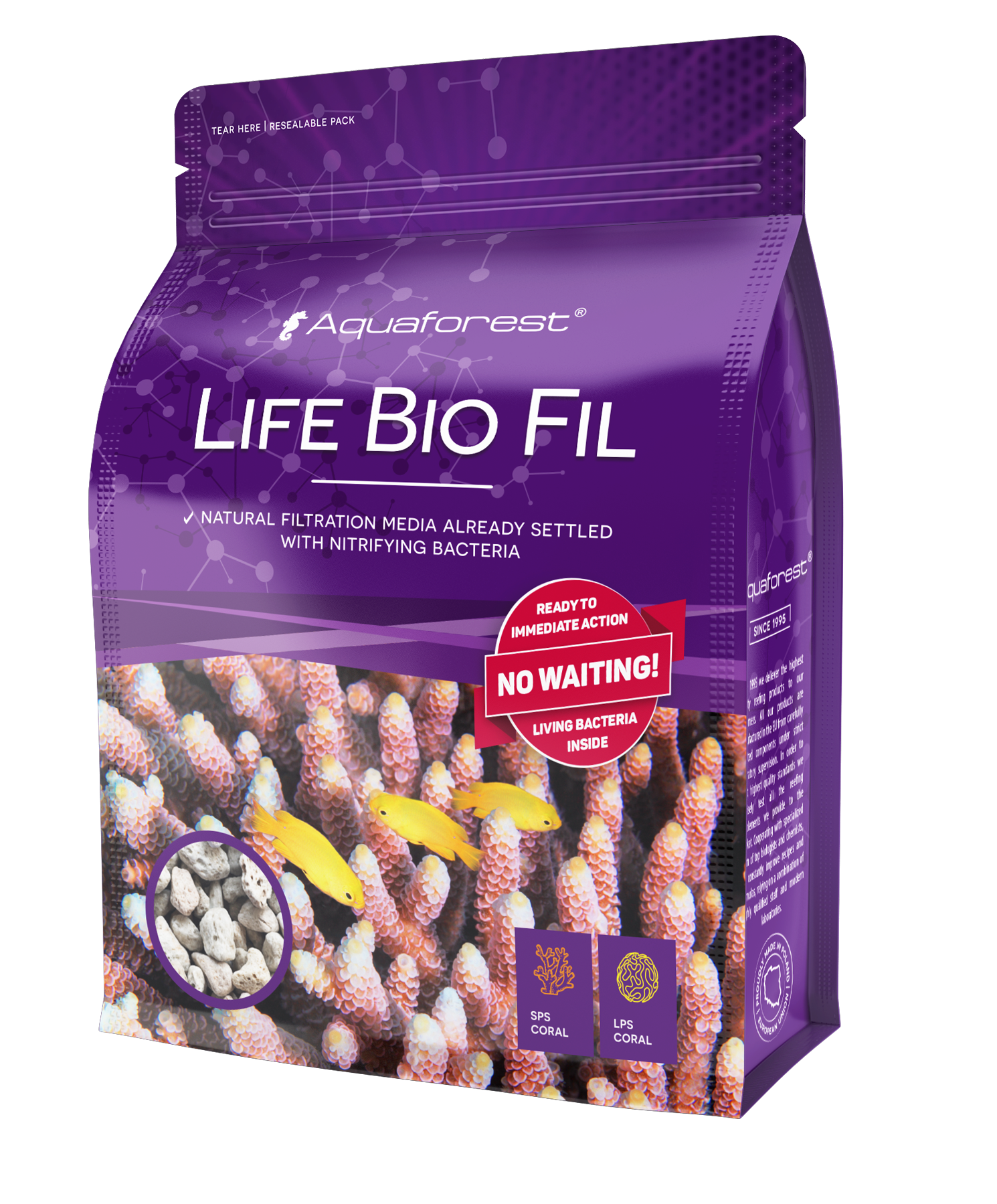 Life Bio Fil is a natural biological filtration media. Due to carefully selected bacterial strains it initiates and supports the nitrification process which accelerates maturity. Life Bio Fil is perfect filtration media for newly established tanks. Life Bio Fil will also increase efficiency of filtration in older, already functioning tanks. Due to content of bacteria it starts nitrification process almost immediately – there’s no need to wait for the settlement of the medium. Life Bio Fil should be placed in the sump in a good water flow. 1000 ml medium should be used in an aquarium with a capacity of 400 l. We recommend to replace 10 -20 % of the filling every 6 weeks.