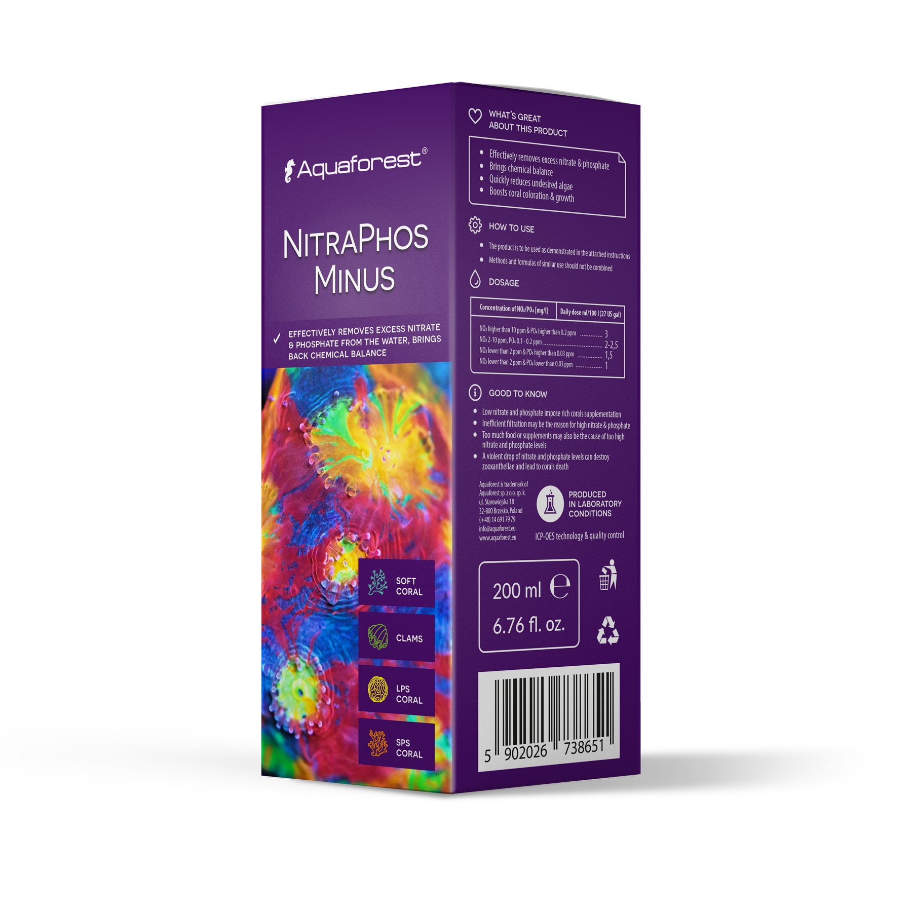 NitraPhos Minus is a unique formula that aims to biologically remove nitrate, nitrite and phosphate from the aquarium. It activates the metabolism in various types of bacteria, which are responsible for the management and removal of excess nutrients. Thanks to the special composition of multiple forms of organic carbon, amino acids and vitamins, all biochemical changes occur without any issues and bacteria easily absorb compounds to convert them into biomass. That biomass becomes a valuable food for corals while the excess and residues of it are removed from water by filter or skimmer. NitraPhos Minus improves the overall condition of corals, provides better colouration and promotes their growth. Due to maintaining the biological balance in the tank it prevents the formation of undesirable green algae and the development of cyanobacteria.