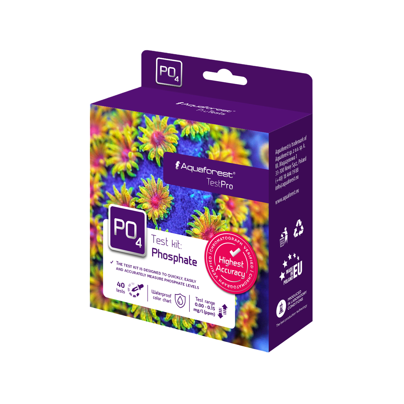 AF Phosphate TestPro is designed for quick measurement of phosphate ions in a marine aquarium. Phosphate is a breeding ground for the growth of undesired algae, so it is very important to constantly monitor its concentration in marine tanks. In addition, a high concentration of phosphate may be harmful to corals. Phosphate levels in the marine aquarium should not exceed 0.02 mg/l (ppm). This Test Kit contains sufficient reagents to perform 40 tests of phosphate concentration. SET: Reagent A-PO4 bottle, Reagent B-PO4 container, 1 test vial with a screw cap, Syringe – 5 ml, Syringe – 1 ml, Measuring spoon, Instruction manual, Color chart