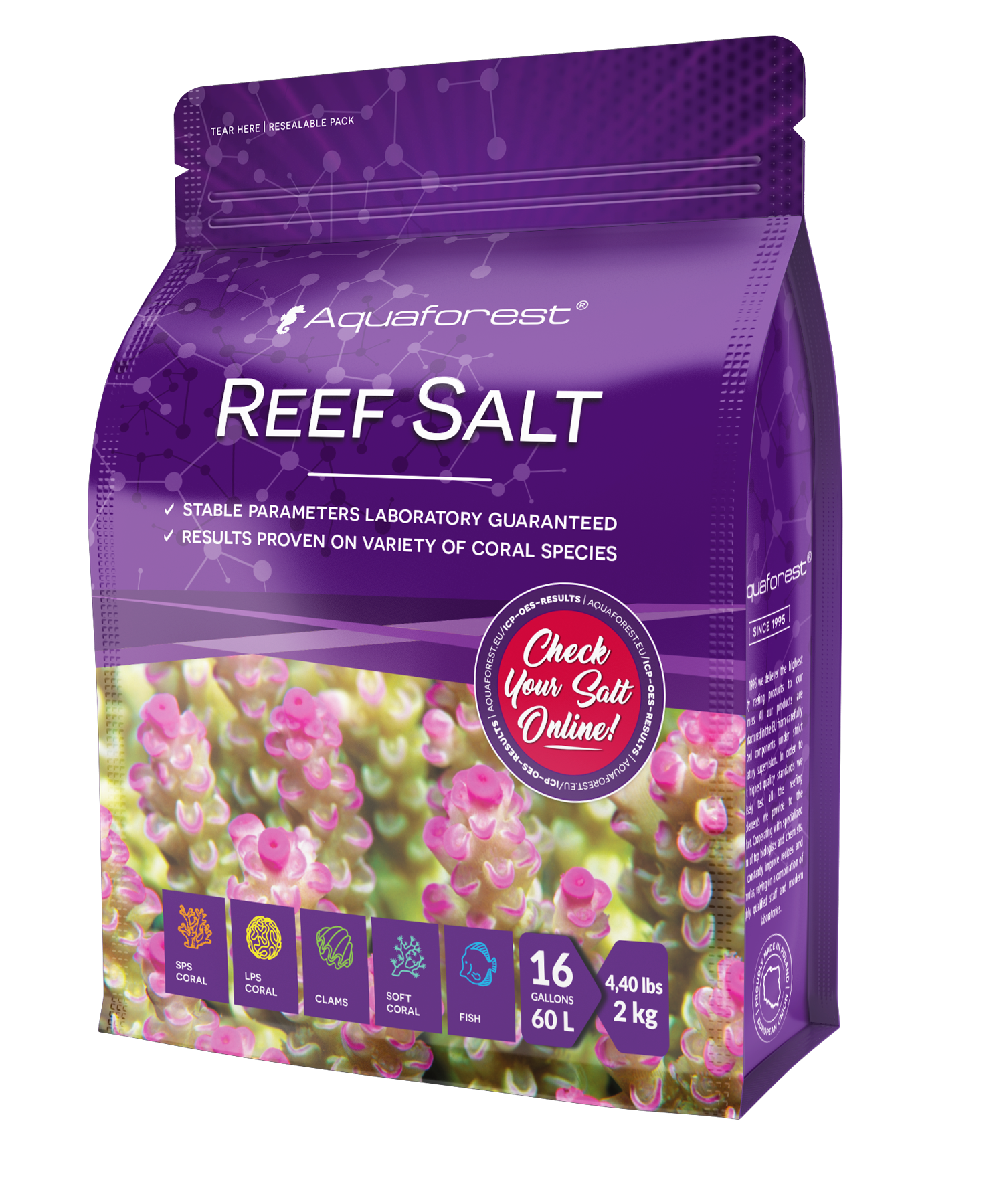 Fully synthetic marine salt created for aquacultured corals. This formula is designed to create the best conditions for marine animals. The micro-nutrients and macro-nutrients in Aquaforest Reef Salt fulfill corals’ demand for proper growth and pigmentation. After dissolving the salt, your freshly prepared marine water can be used immediately. The salt mix is enriched with amino acids and Vitamin C. The addition of Vitamin C encourages growth and has positive effects on the overall health of all aquarium inhabitants. PREPARATION: Dissolve the salt in previously prepared demineralized water. Water temperature should be about 24°C (75°F). For salinity of 33 ppt (1.025 S.G.), dissolve about 390 g (13.75 oz.) in 10 l (2.7 US gal) of water. Stir the solution vigorously for about 15 minutes. Once the salt is fully dissolved and the solution is clear, the saline water is ready to use. Keep the salt in a dry and dark place. Once dissolved, use the salt within 5 days. Evaporation can change water parameters, so keep freshly mixed saltwater in a sealed container if you don’t use it right away. You should check the salinity of your saltwater again before use if you store it for a couple of days. This product is for aquarium use only. Not suitable for human consumption. Keep away from children. Safety data sheet available on request.